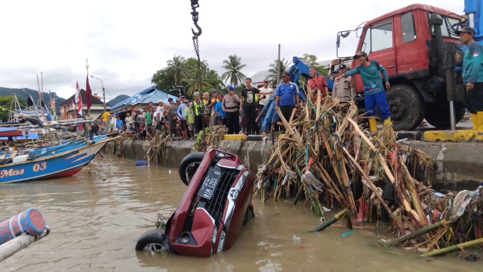 Tumpukan sampah juga terlihat mengendap di sekitar area dermaga. Petugas dari Satlantas Polres Sukabumi bersama tim dari PPNP segera melakukan evakuasi terhadap kendaraan yang terseret arus.