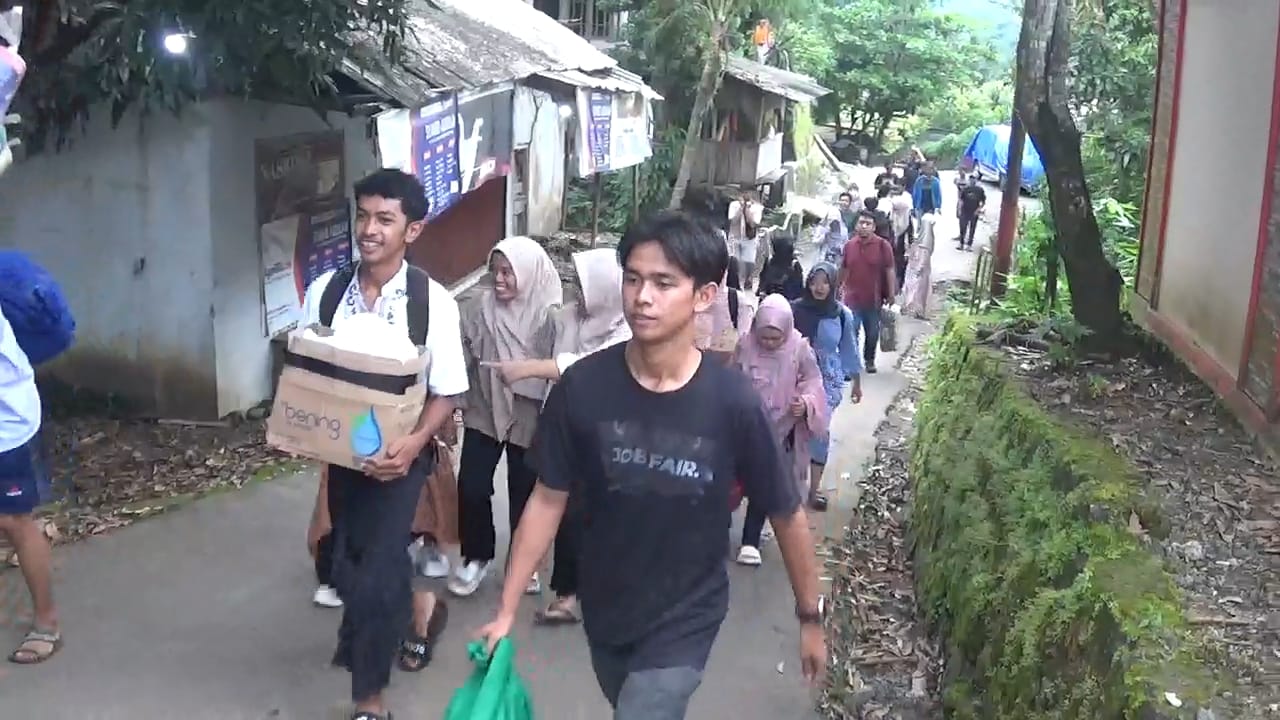 Seputarankita.com – SUKABUMI – Puluhan siswa SMK Jamiyyatul Aulad Palabuhanratu, berjalan kaki untuk sampai ke lokasi bencana banjir bandang dan tanah longsor di Desa Cibuntu Kecamatan Simpenan Kabupaten Sukabumi. Kedatangan mereka untuk memberikan bantuan pada para korban.